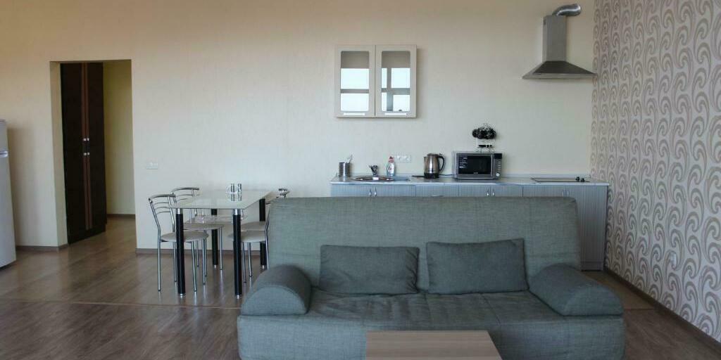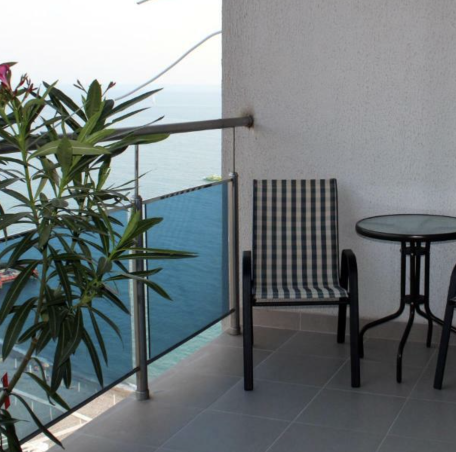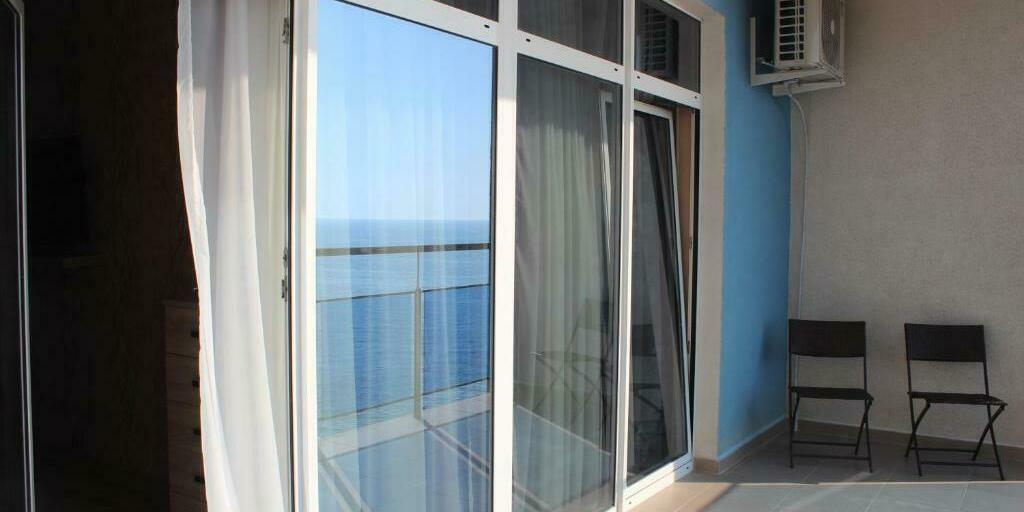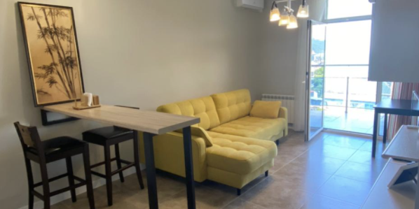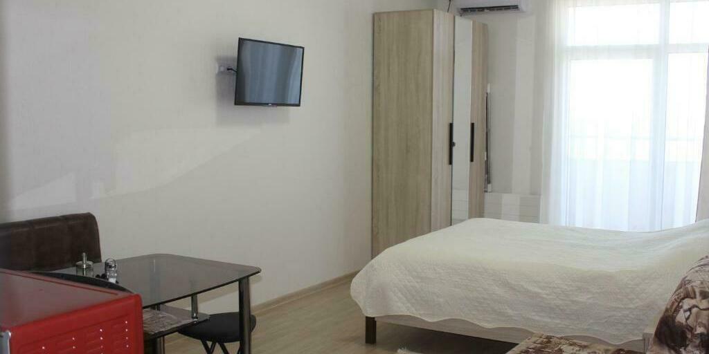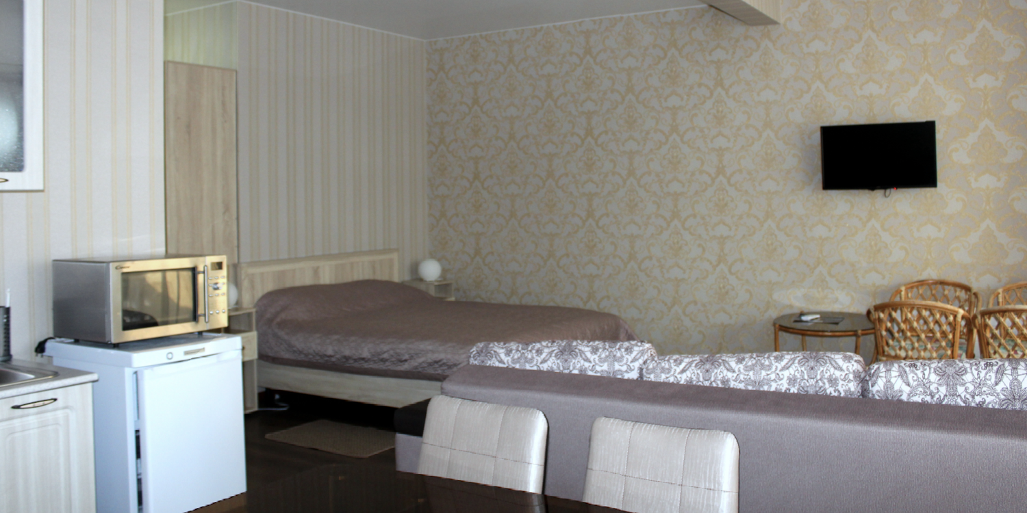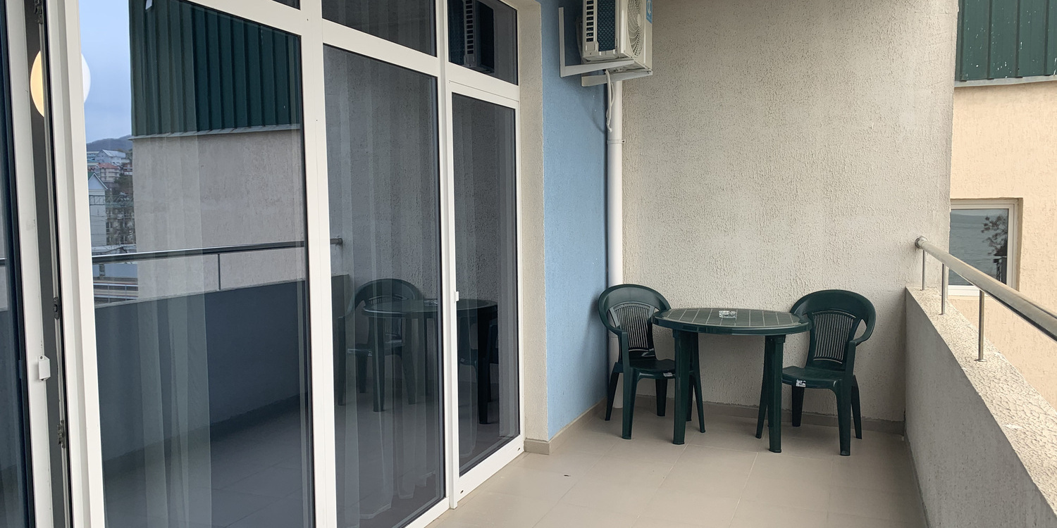 Апартаменты  представляют собой однокомнутную студию с кухней и обеденной зоной, двусапльной кроватью и раскладным диваном.  Имеют балкон с видом на море, поселок и окружающие горы с мебелью для отдыха. Находятся на 7 этаже. Максимальная вместимость 3 человека.