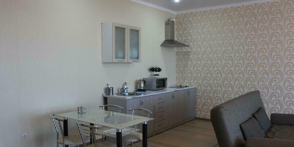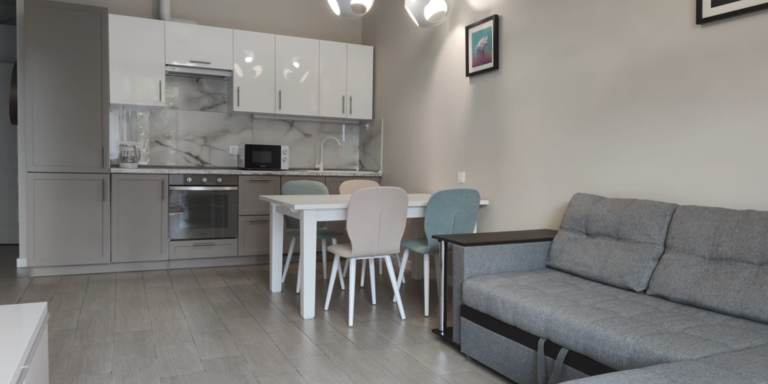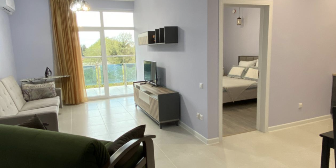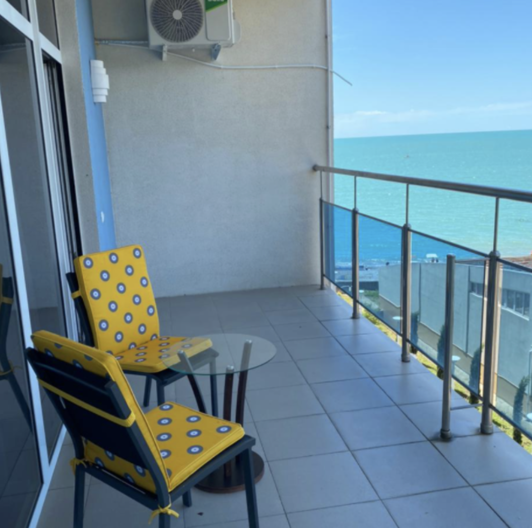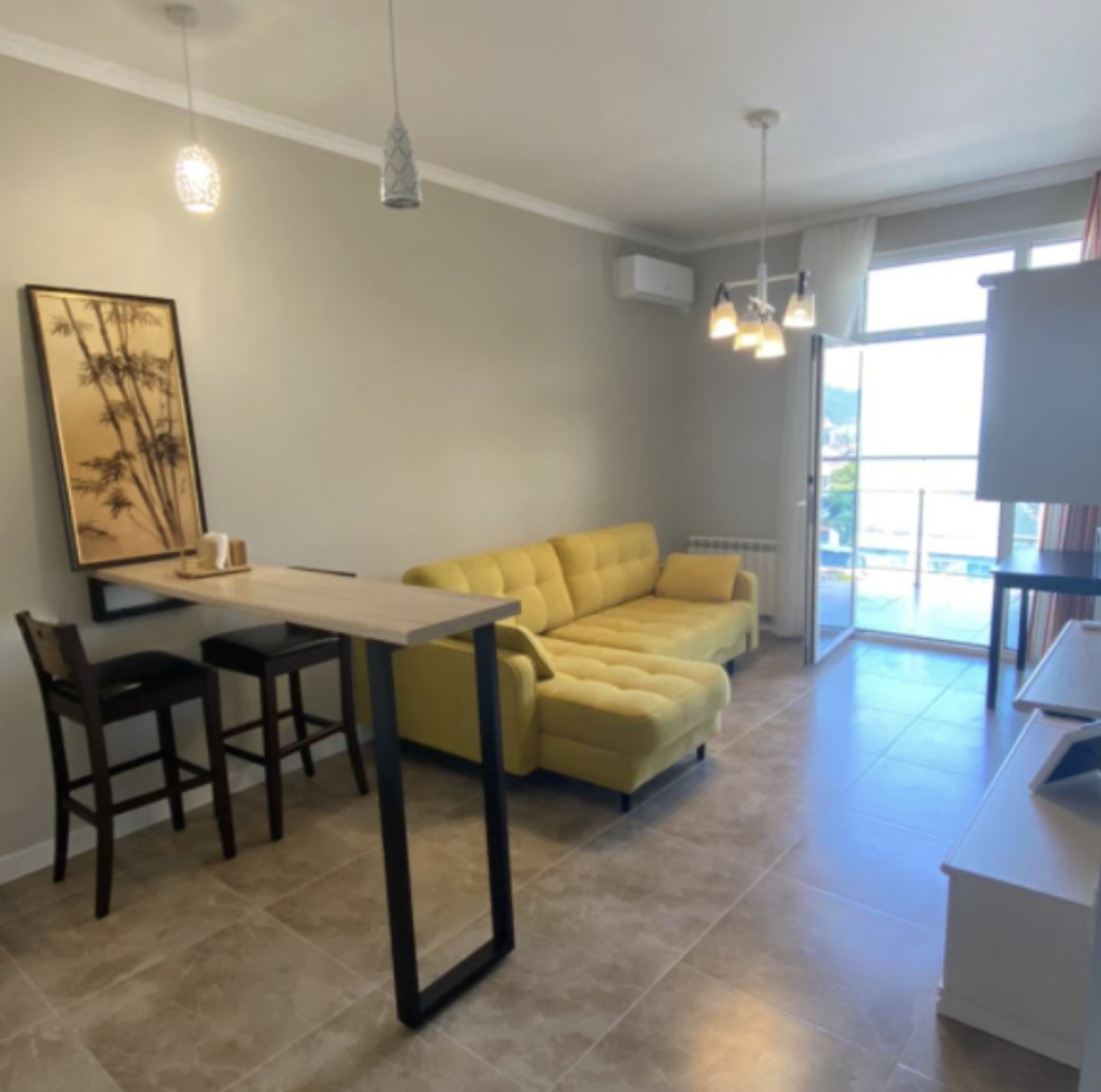 Апартаменты  представляют собой однокомнутную студию с кухней и обеденной зоной, двусапльной кроватью и раскладным диваном.  Имеют балкон с видом на море, поселок и окружающие горы с мебелью для отдыха. Находятся на 7 этаже. Максимальная вместимость 3 человека.