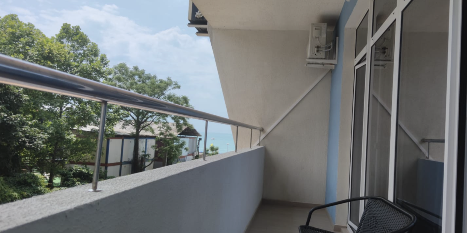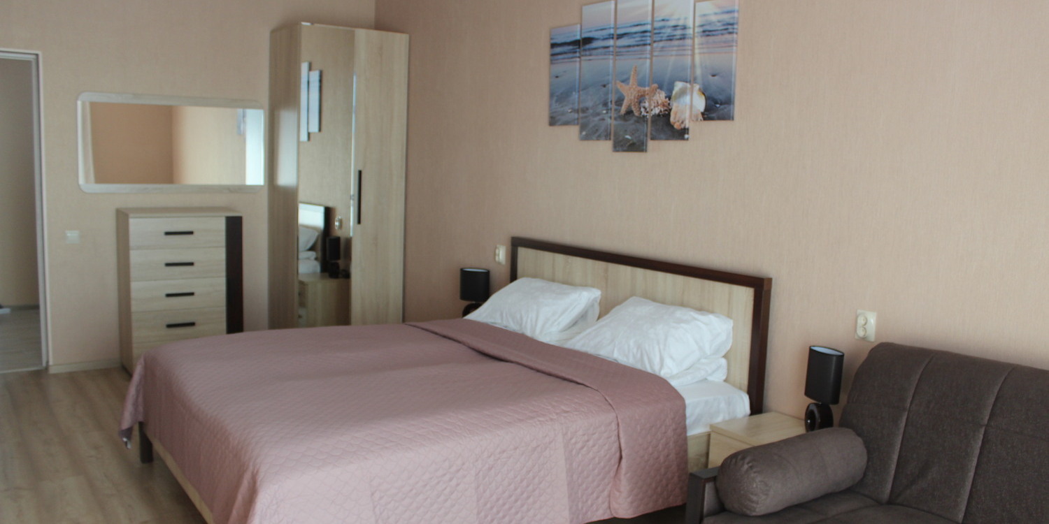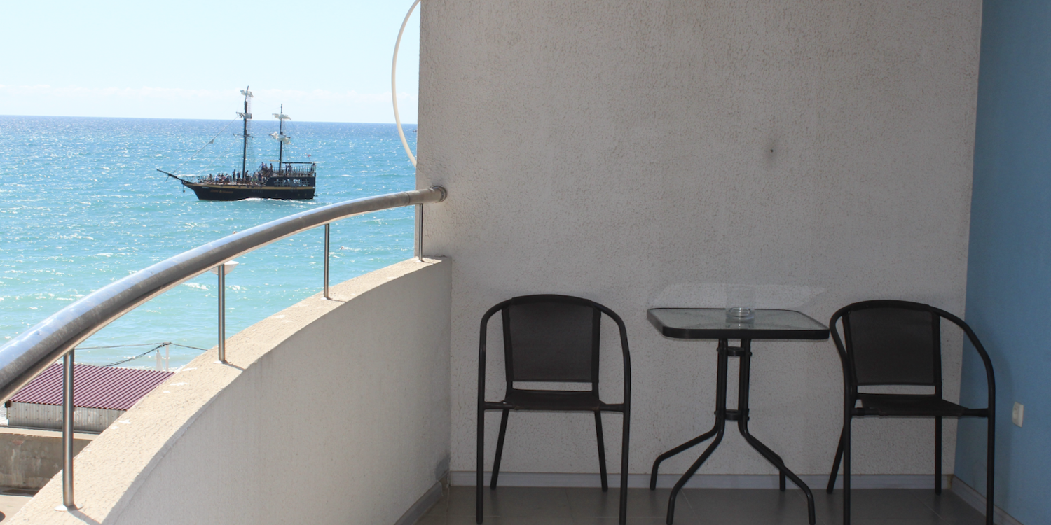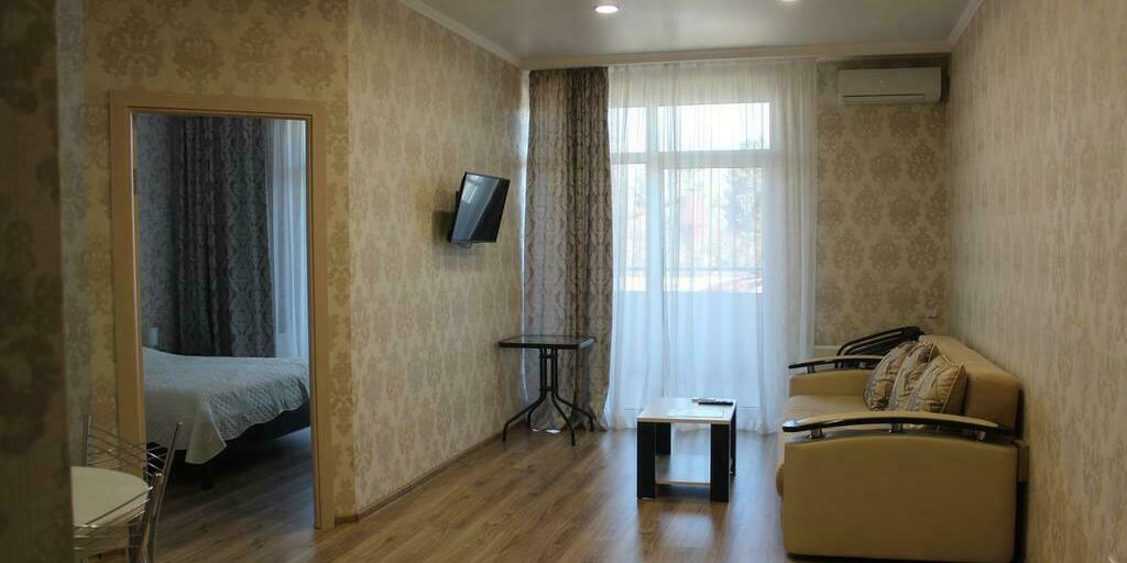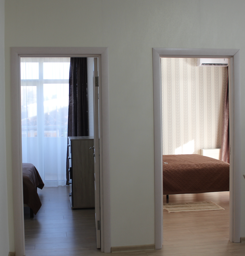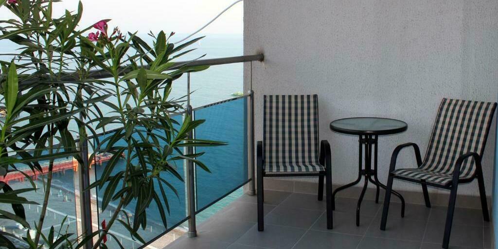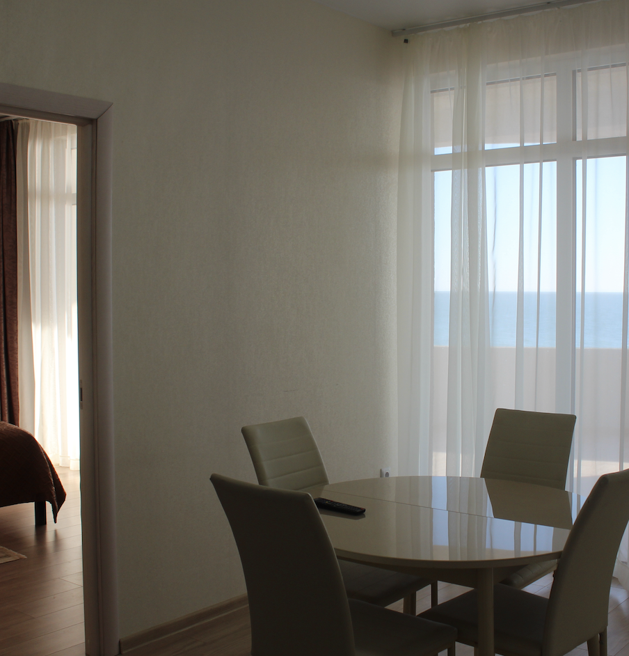 Апартаменты с  гостиной оборудованной двумя раскладными диванами, обеденной и кухонной зоной, в спальне двуспальная кровать комод и шкаф.  Апартаменты имеют балкон с боковым видом на море. Апартаменты данного типа подходят для семьи с двумя и более детьми. Находятся на втором этаже. Максимальная вместимость 6 человек.