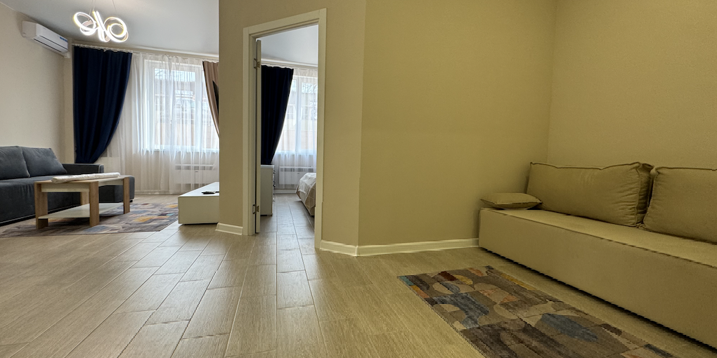 Апартаменты представляют собой двухкомнатную квартиру с  гостиной, обеденной и кухонной зоной, имеют двуспальную кровать и два раскладных дивана.   Апартаменты данного типа подходят для семьи с двумя детьми и более. Без балкона. Находятся на 1 этаже. Максимальная вместимость 6 человек.
